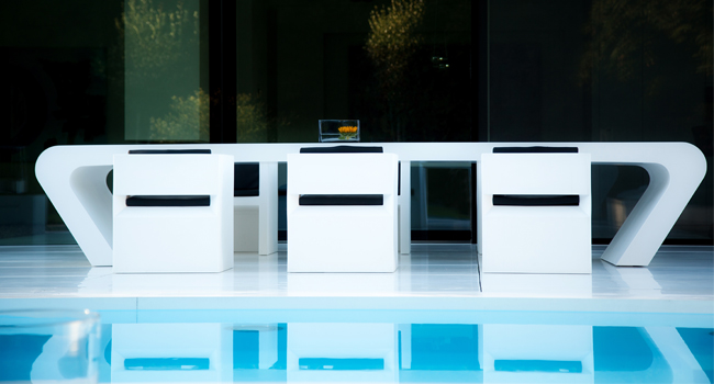 Sulla magnifica terrazza di Casa DREER pavimento, tavolo, le sedie “Vondom” e la zona lounge sono state interamente realizzate in pietra acrilica HI-MACS®. Questo materiale innovativo che combina in modo unico design, comfort e funzionalità conferisce a questo spazio, progettato per trascorrere del tempo con gli amici e la famiglia, tutto il senso della tradizione artigianale unito ad un design altamente innovativo.